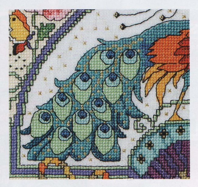 I hope that this magnificent peacock design will be a sheer joy to stitch with its palette of brightly coloured stranded cottons and metallic threads.