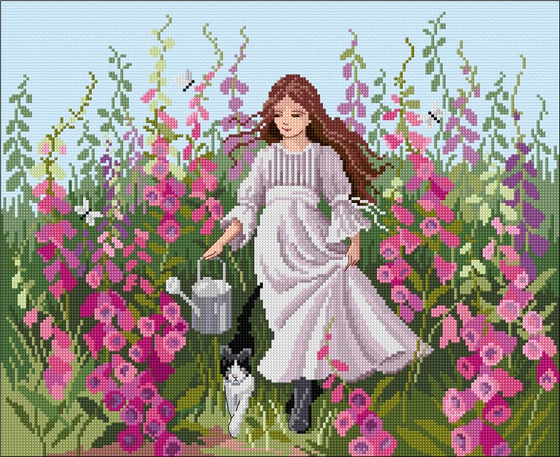 The picture of a young girl with her cat, walking through a garden full of foxgloves, is my latest design to appear in issue 154 of Cross Stitch GOLD which is out now.