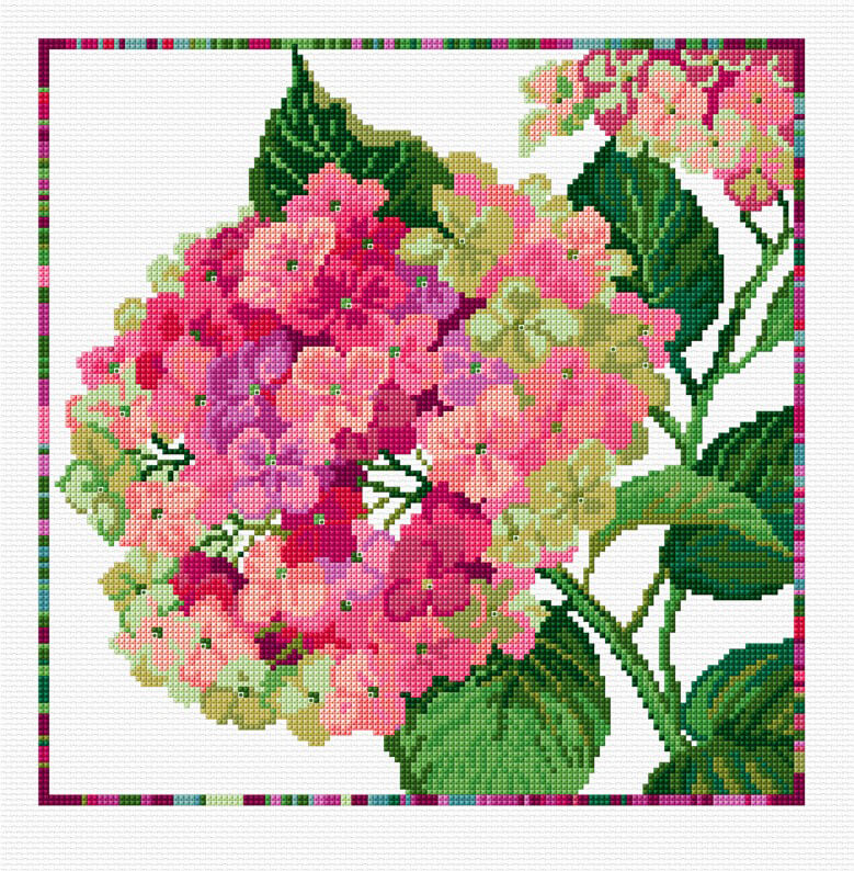 I will shortly be adding more large floral pictures to my shop. The beautiful Opium poppy is now available - see above - and a pink rose, pink hydrangea as seen here and anemones and an iris will be added in the next couple of weeks. All are simple to stitch as only whole cross stitches are used.