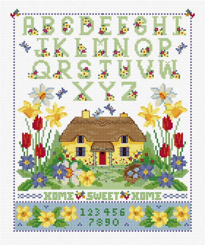This bright and cheerful Spring cottage sampler, with mainly whole stitches, is easy to stitch. The alphabet can be used on its own to personalise special cards and gifts. Stitch it on 14 count white Aida or 28 count evenweave.